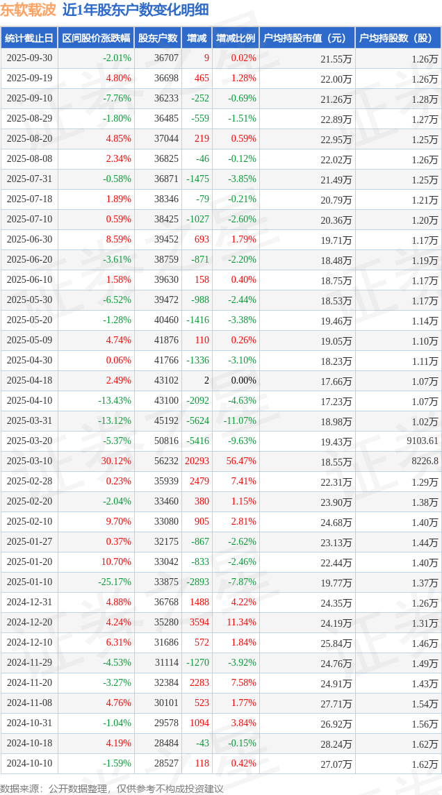 从股价来看,2025年9月19日至2025年9月30日,东软载波区间跌幅为2.01%,在此期间股东户数增加9.0户,增幅为0.02%。
