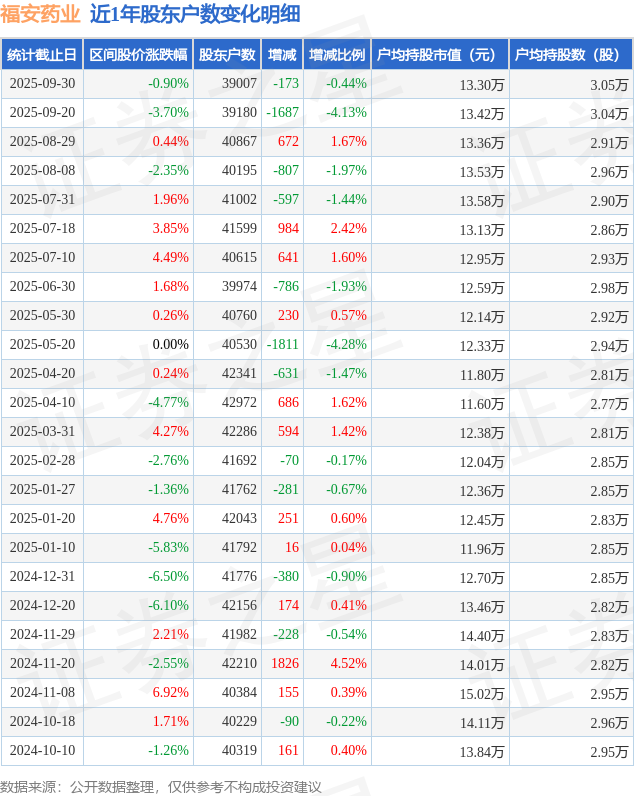 从股价来看,2025年9月20日至2025年9月30日,福安药业区间跌幅为0.9%,在此期间股东户数减少173.0户,减幅为0.44%。