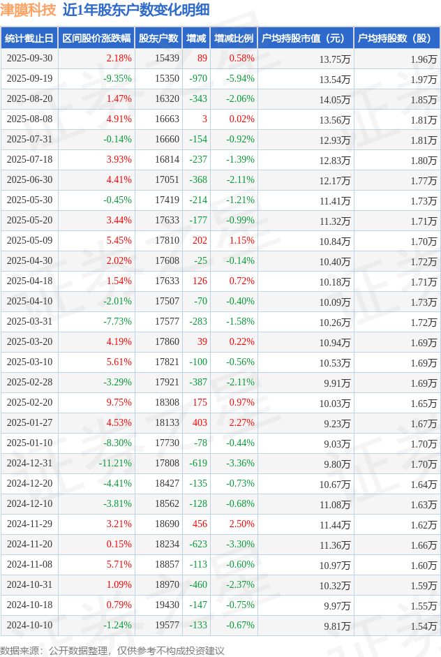 从股价来看,2025年9月19日至2025年9月30日,津膜科技区间涨幅为2.18%,在此期间股东户数增加89.0户,增幅为0.58%。