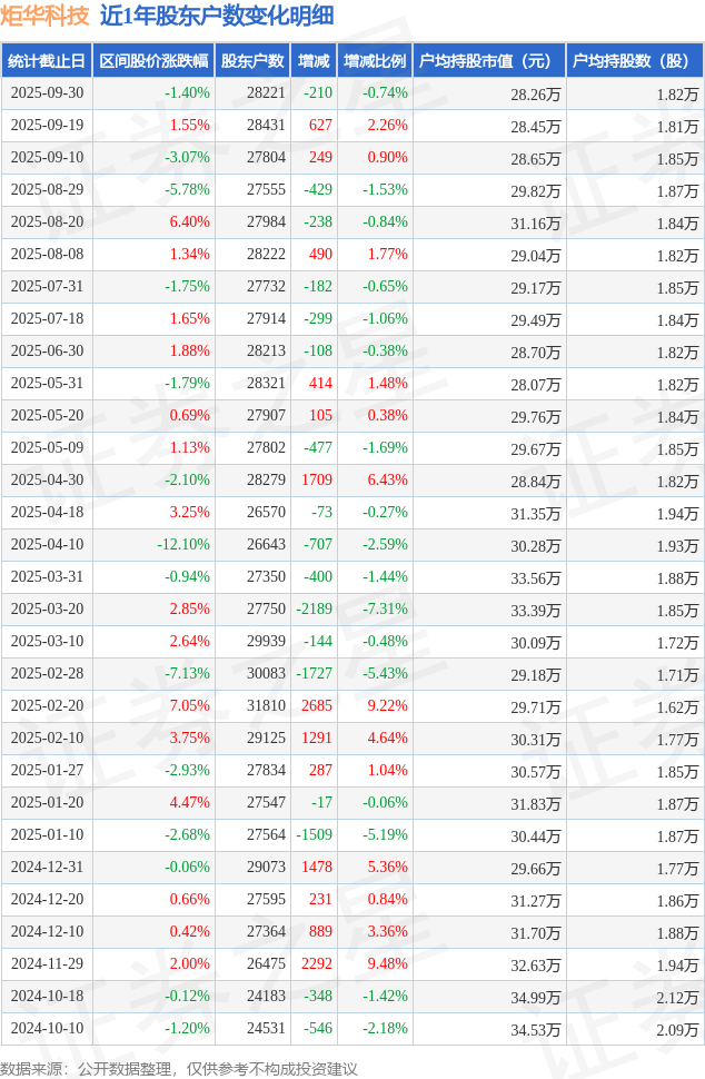 从股价来看,2025年9月19日至2025年9月30日,炬华科技区间跌幅为1.4%,在此期间股东户数减少210.0户,减幅为0.74%。