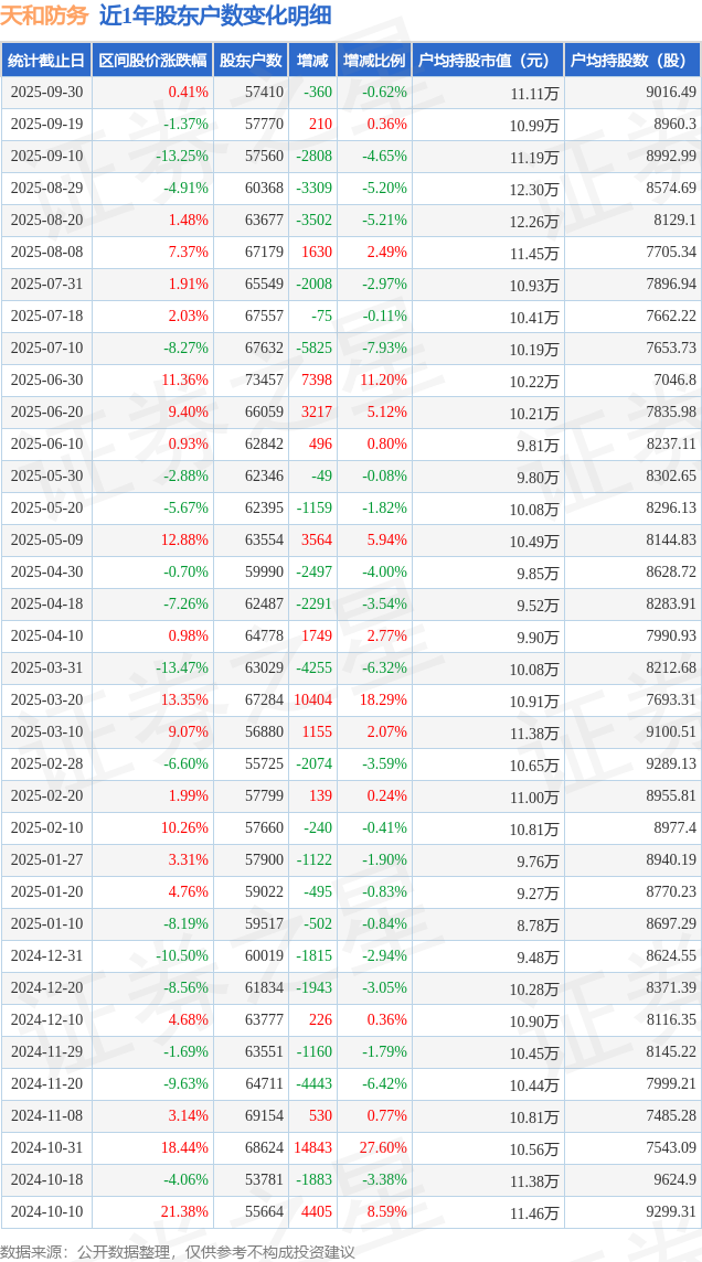 从股价来看,2025年9月19日至2025年9月30日,天和防务区间涨幅为0.41%,在此期间股东户数减少360.0户,减幅为0.62%。