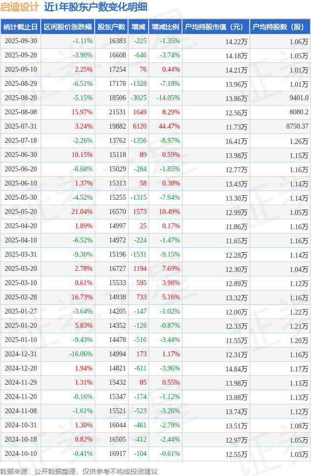 从股价来看,2025年9月20日至2025年9月30日,启迪设计区间跌幅为1.11%,在此期间股东户数减少225.0户,减幅为1.35%。