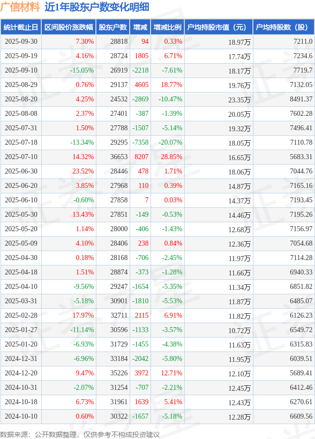 从股价来看,2025年9月19日至2025年9月30日,广信材料区间涨幅为7.3%,在此期间股东户数增加94.0户,增幅为0.33%。