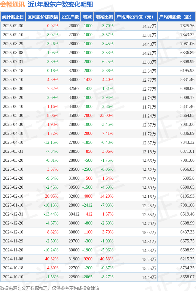 从股价来看,2025年9月19日至2025年9月30日,会畅通讯区间涨幅为0.92%,在此期间股东户数减少1000.0户,减幅为3.7%。
