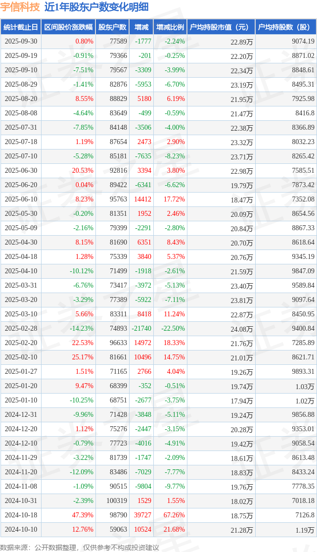 从股价来看,2025年9月19日至2025年9月30日,宇信科技区间涨幅为0.8%,在此期间股东户数减少1777.0户,减幅为2.24%。