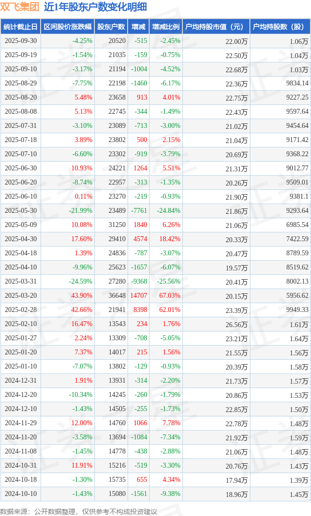 从股价来看,2025年9月19日至2025年9月30日,双飞集团区间跌幅为4.25%,在此期间股东户数减少515.0户,减幅为2.45%。