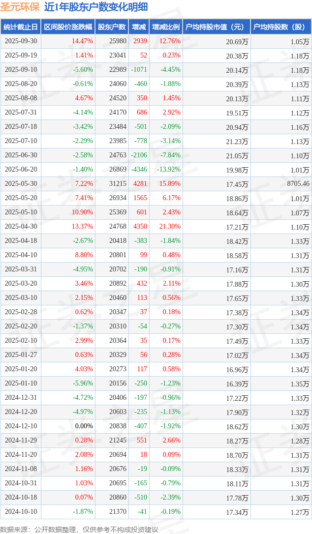 从股价来看,2025年9月19日至2025年9月30日,圣元环保区间涨幅为14.47%,在此期间股东户数增加2939.0户,增幅为12.76%。