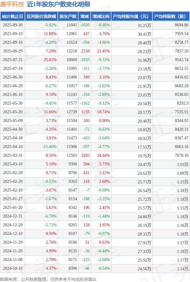 从股价来看,2025年9月19日至2025年9月30日,康平科技区间跌幅为5.92%,在此期间股东户数减少1020.0户,减幅为8.46%。