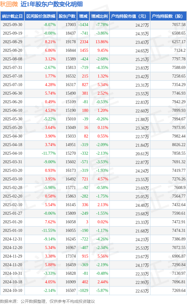 从股价来看,2025年9月19日至2025年9月30日,秋田微区间跌幅为8.07%,在此期间股东户数减少1434.0户,减幅为7.78%。