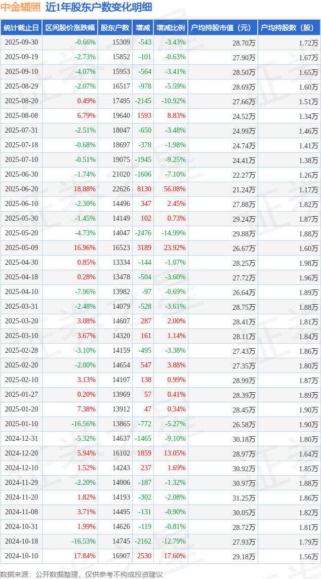 证券之星消息,近日中金辐照披露,截至2025年9月30日公司股东户数为1.53万户,较9月19日减少543.0户,减幅为3.43%。户均持股数量由上期的1.67万股增加至1.72万股,户均持股市值为28.7万元。