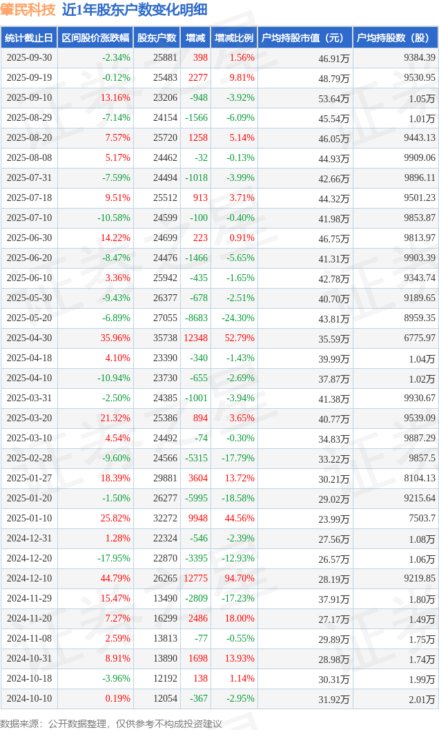 从股价来看,2025年9月19日至2025年9月30日,肇民科技区间跌幅为2.34%,在此期间股东户数增加398.0户,增幅为1.56%。