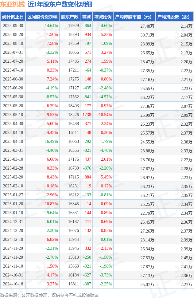 从股价来看,2025年8月20日至2025年9月30日,东亚机械区间跌幅为14.64%,在此期间股东户数减少864.0户,减幅为4.6%。
