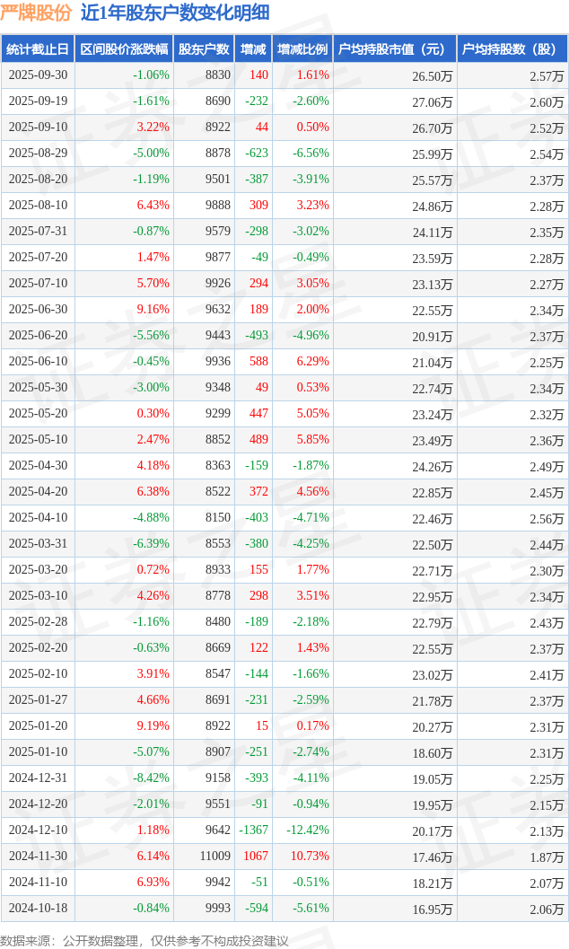 从股价来看,2025年9月19日至2025年9月30日,严牌股份区间跌幅为1.06%,在此期间股东户数增加140.0户,增幅为1.61%。