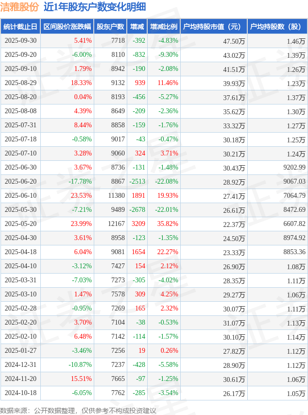 从股价来看,2025年9月20日至2025年9月30日,洁雅股份区间涨幅为5.41%,在此期间股东户数减少392.0户,减幅为4.83%。