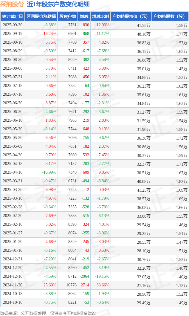 从股价来看,2025年9月19日至2025年9月30日,采纳股份区间跌幅为3.38%,在此期间股东户数增加830.0户,增幅为12.03%。