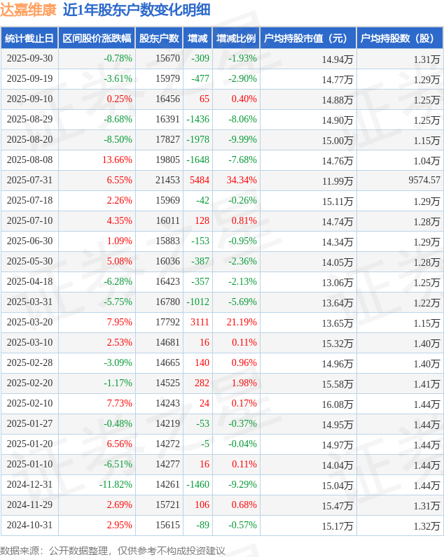 从股价来看,2025年9月19日至2025年9月30日,达嘉维康区间跌幅为0.78%,在此期间股东户数减少309.0户,减幅为1.93%。