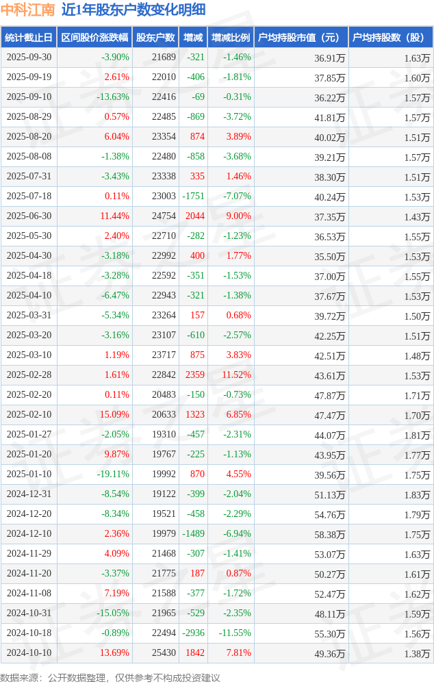 从股价来看,2025年9月19日至2025年9月30日,中科江南区间跌幅为3.9%,在此期间股东户数减少321.0户,减幅为1.46%。