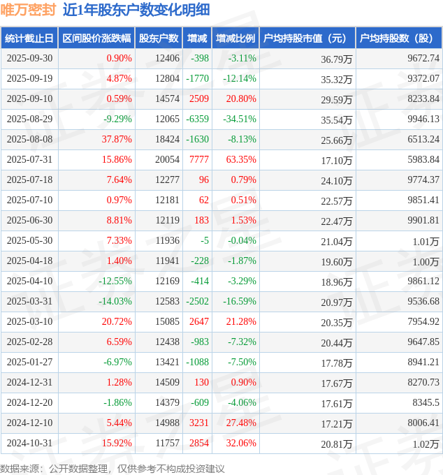 从股价来看,2025年9月19日至2025年9月30日,唯万密封区间涨幅为0.9%,在此期间股东户数减少398.0户,减幅为3.11%。