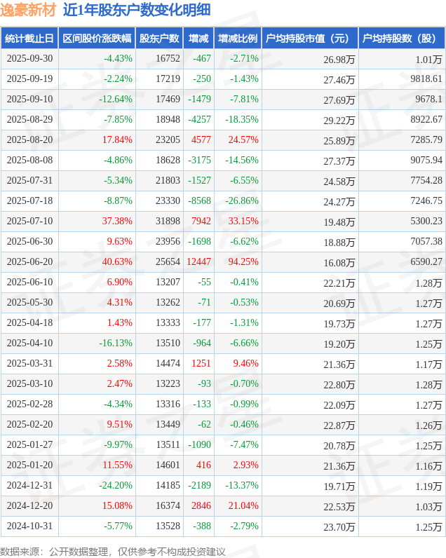 从股价来看,2025年9月19日至2025年9月30日,逸豪新材区间跌幅为4.43%,在此期间股东户数减少467.0户,减幅为2.71%。