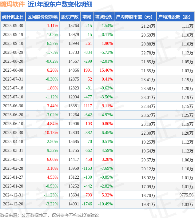 从股价来看,2025年9月19日至2025年9月30日,鸥玛软件区间涨幅为1.11%,在此期间股东户数减少215.0户,减幅为1.54%。