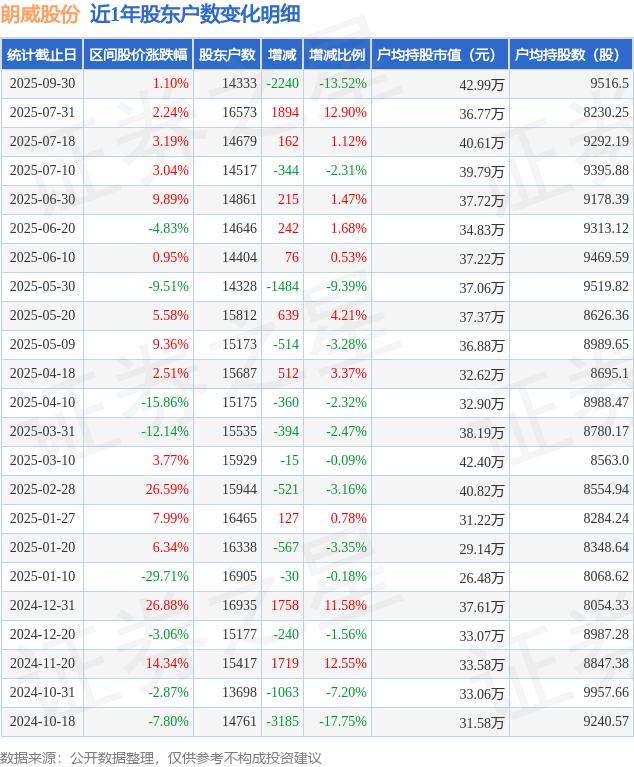从股价来看,2025年7月31日至2025年9月30日,朗威股份区间涨幅为1.1%,在此期间股东户数减少2240.0户,减幅为13.52%。
