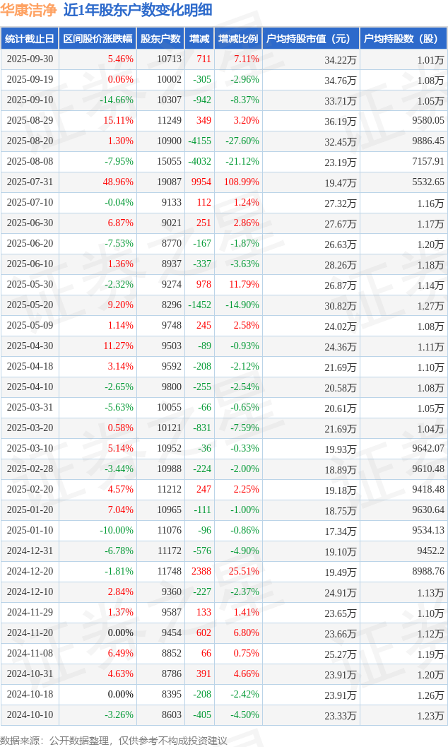 从股价来看,2025年9月19日至2025年9月30日,华康洁净区间涨幅为5.46%,在此期间股东户数增加711.0户,增幅为7.11%。