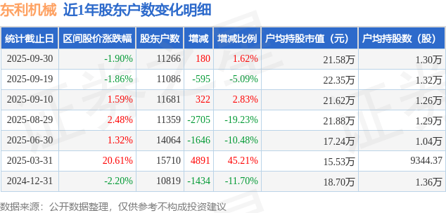 从股价来看,2025年9月19日至2025年9月30日,东利机械区间跌幅为1.9%,在此期间股东户数增加180.0户,增幅为1.62%。