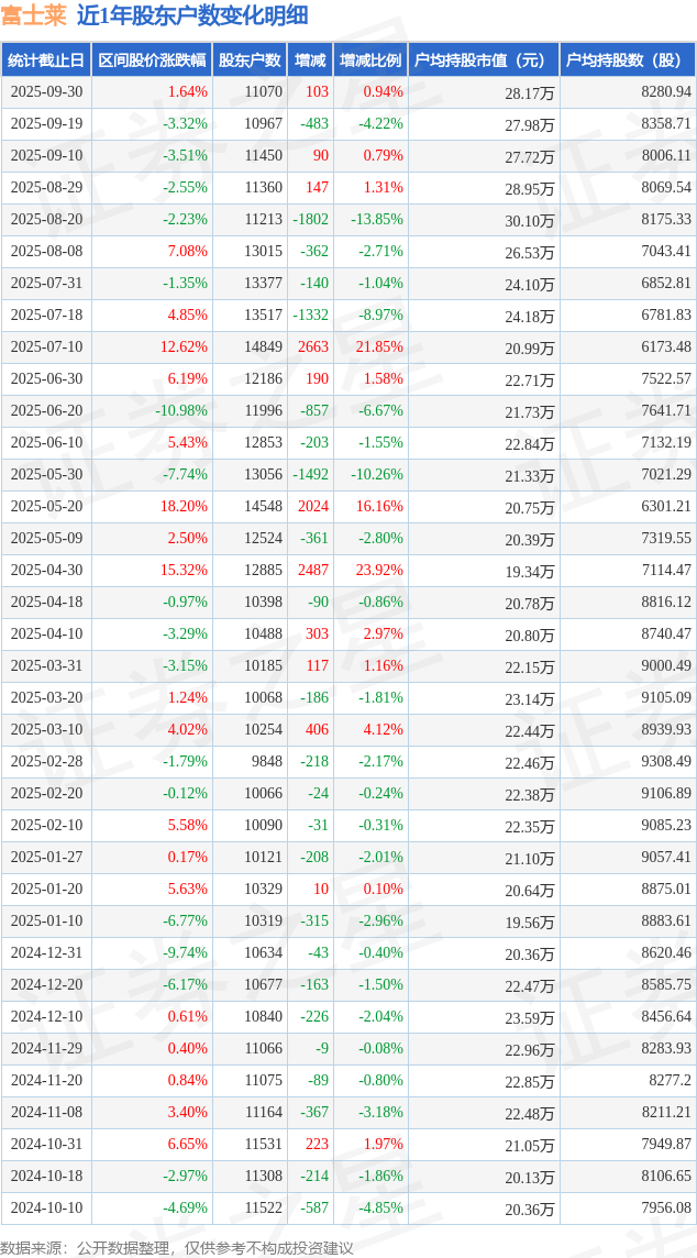 从股价来看,2025年9月19日至2025年9月30日,富士莱区间涨幅为1.64%,在此期间股东户数增加103.0户,增幅为0.94%。