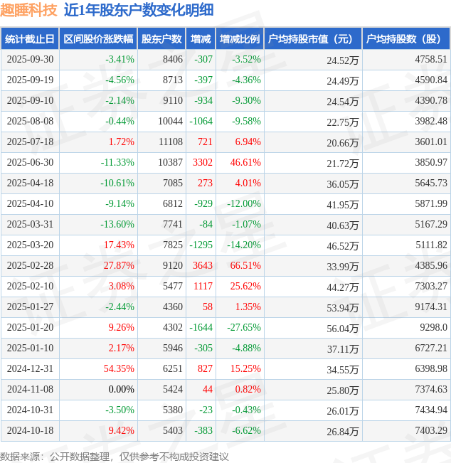 从股价来看,2025年9月19日至2025年9月30日,趣睡科技区间跌幅为3.41%,在此期间股东户数减少307.0户,减幅为3.52%。