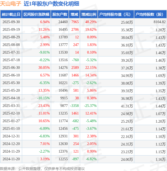 从股价来看,2025年9月19日至2025年9月30日,天山电子区间涨幅为6.94%,在此期间股东户数增加7965.0户,增幅为48.29%。