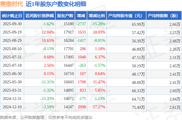 从股价来看,2025年9月19日至2025年9月30日,赛维时代区间跌幅为1.62%,在此期间股东户数减少2737.0户,减幅为15.28%。