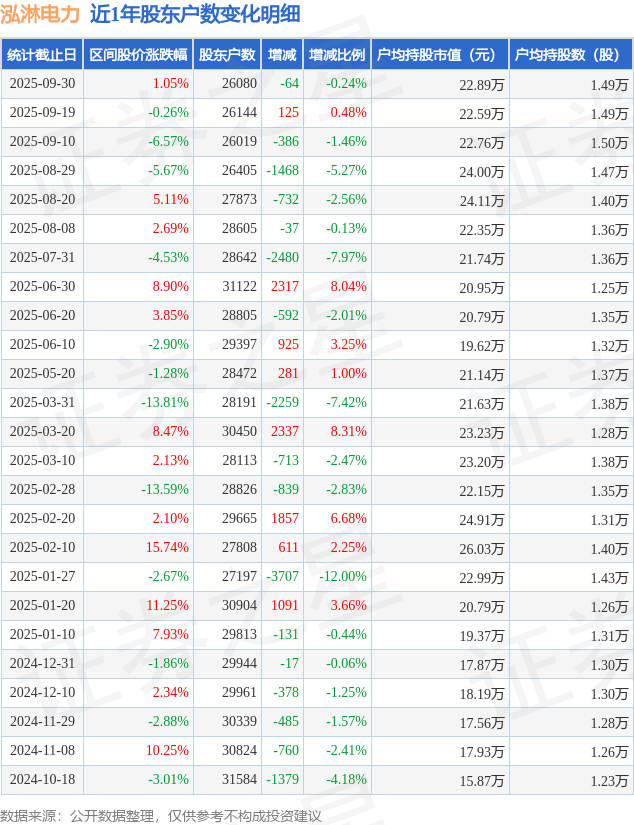 从股价来看,2025年9月19日至2025年9月30日,泓淋电力区间涨幅为1.05%,在此期间股东户数减少64.0户,减幅为0.24%。