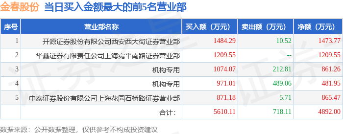 证券之星消息,沪深交易所2025年10月10日公布的交易公开信息显示,金春股份(300877)因日涨幅达到15%的前5只证券登上龙虎榜。此次是近5个交易日内第1次上榜。