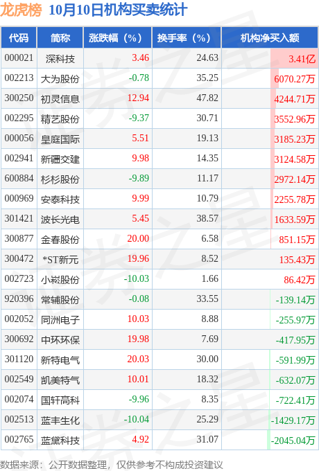 当日公布的交易所龙虎榜中有机构专用席位现身的个股共32家,其中深科技以净买入3.41亿元排名第一。详情见下表: