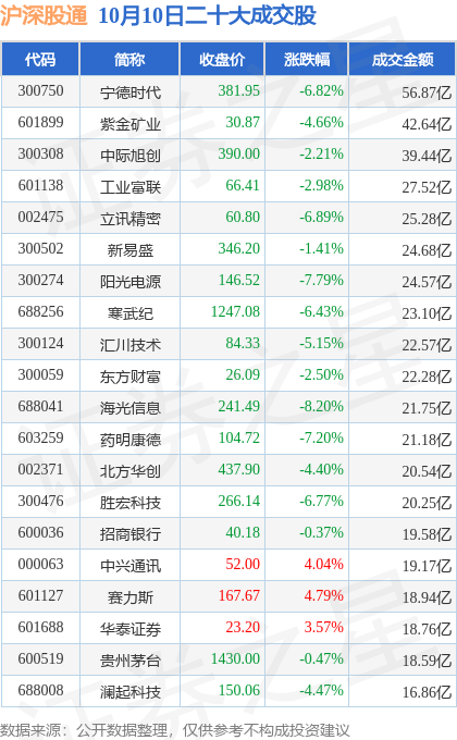 当日北向资金余额额度充足,宝泰隆(601011)领涨,涨幅10.1%,交易所公布的沪深股通二十大成交股中成交额前三的为宁德时代、紫金矿业、中际旭创,成交额分别为56.87亿元、42.64亿元、39.44亿元。详情可见下表: