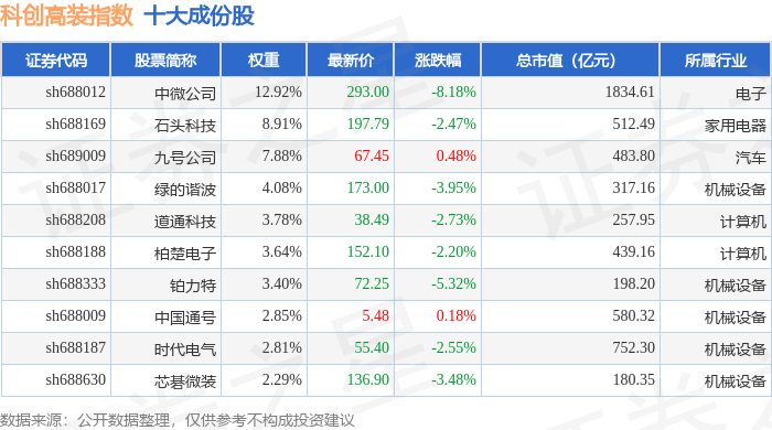证券之星消息,10月10日,科创高装(000687)指数报收于1327.0点,跌3.03%,成交291.2亿元,换手率2.16%。当日该指数成份股中,上涨的有10家,中国电研以8.55%的涨幅领涨,下跌的有40家,海目星以10.1%的跌幅领跌。