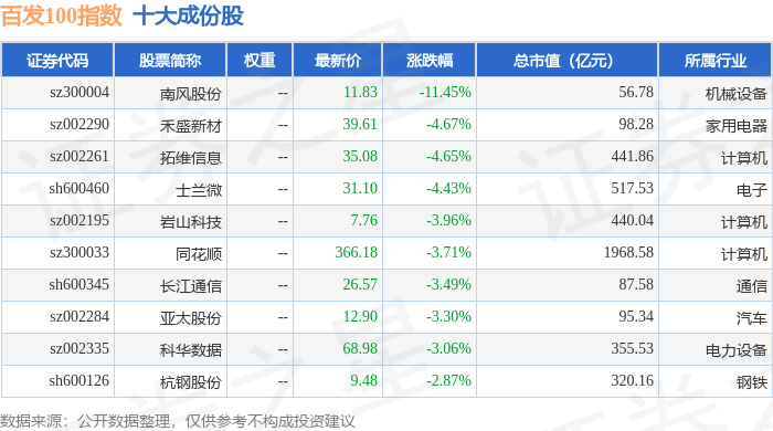 证券之星消息,10月10日,百发100(000851)指数报收于19954.57点,跌0.07%,成交650.25亿元,换手率1.9%。当日该指数成份股中,上涨的有47家,德尔未来以10.08%的涨幅领涨,下跌的有38家,南风股份以11.45%的跌幅领跌。