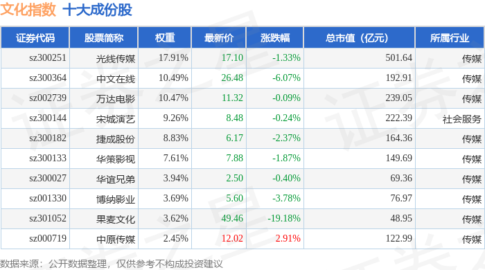 文化指数(399248)十大成份股详情如下: