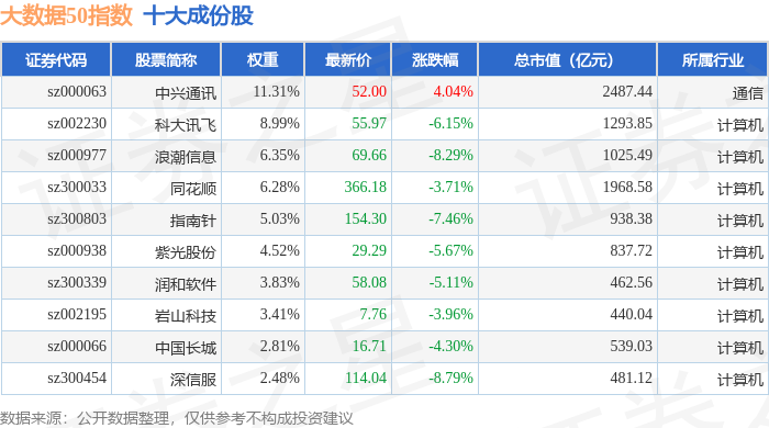 证券之星消息,10月10日,大数据50(399282)指数报收于5707.76点,跌3.59%,成交939.78亿元,换手率4.61%。当日该指数成份股中,上涨的有5家,迪普科技以5.35%的涨幅领涨,下跌的有45家,深信服以8.79%的跌幅领跌。