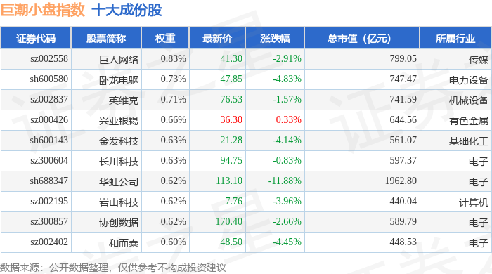 证券之星消息,10月10日,巨潮小盘(399316)指数报收于5966.14点,跌1.73%,成交3805.4亿元,换手率2.48%。当日该指数成份股中,上涨的有237家,华新水泥以10.01%的涨幅领涨,下跌的有256家,惠城环保以13.09%的跌幅领跌。