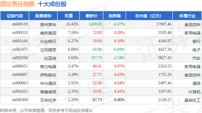 证券之星消息,10月10日,国证责任(399369)指数报收于1551.74点,跌0.81%,成交1394.24亿元,换手率1.29%。当日该指数成份股中,上涨的有60家,华新水泥以10.01%的涨幅领涨,下跌的有37家,深信服以8.79%的跌幅领跌。