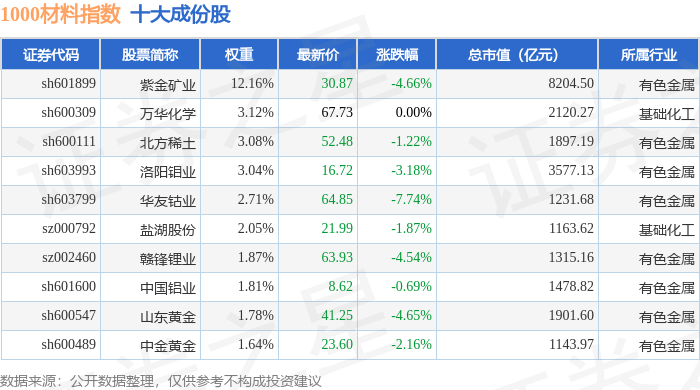 证券之星消息,10月10日,1000材料(399382)指数报收于3488.46点,跌1.52%,成交2098.51亿元,换手率2.63%。当日该指数成份股中,上涨的有72家,华新水泥以10.01%的涨幅领涨,下跌的有60家,华友钴业以7.74%的跌幅领跌。