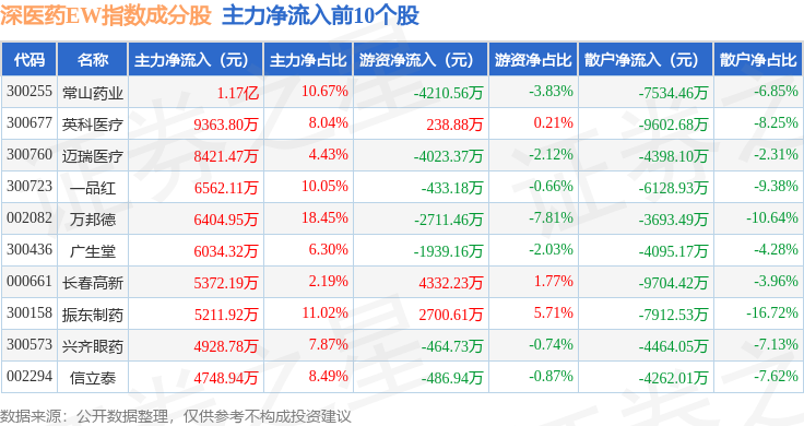 资金流向方面,深医药EW(399676)指数成份股当日主力资金净流出合计5081.91万元,游资资金净流入合计7539.64万元,散户资金净流出合计2457.74万元。成份股资金流向详情见下表: