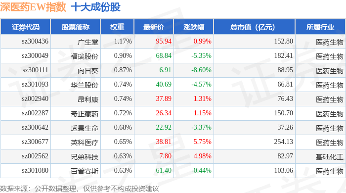 证券之星消息,10月10日,深医药EW(399676)指数报收于3799.49点,跌0.02%,成交474.19亿元,换手率2.06%。当日该指数成份股中,上涨的有130家,万邦德以9.99%的涨幅领涨,下跌的有79家,向日葵以8.6%的跌幅领跌。
