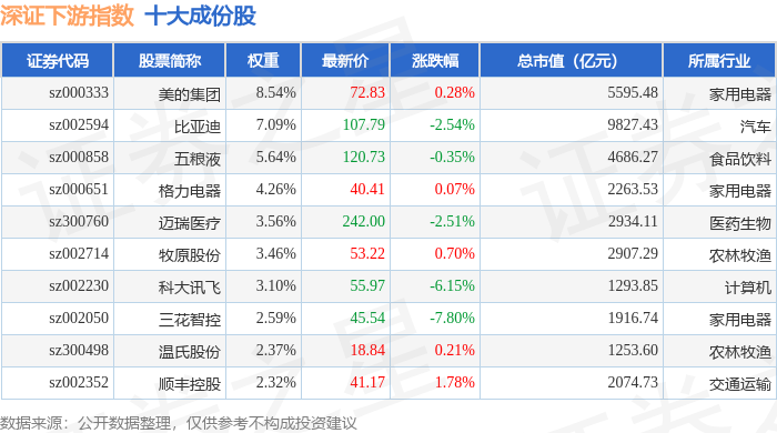 证券之星消息,10月10日,深证下游(399706)指数报收于5970.73点,跌1.79%,成交1215.95亿元,换手率1.81%。当日该指数成份股中,上涨的有35家,长春高新以5.45%的涨幅领涨,下跌的有63家,深信服以8.79%的跌幅领跌。