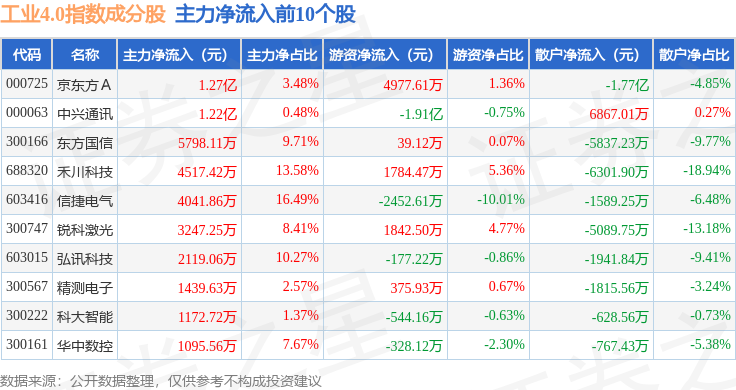 资金流向方面,工业4.0(399803)指数成份股当日主力资金净流出合计152.56亿元,游资资金净流入合计59.82亿元,散户资金净流入合计92.73亿元。成份股资金流向详情见下表: