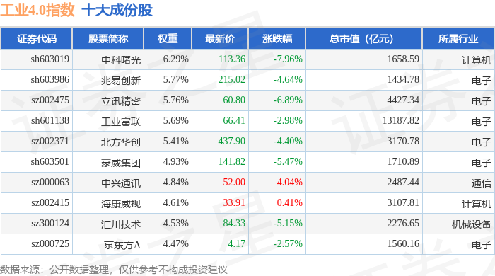 证券之星消息,10月10日,工业4.0(399803)指数报收于5644.16点,跌4.01%,成交1696.61亿元,换手率3.27%。当日该指数成份股中,上涨的有7家,中兴通讯以4.04%的涨幅领涨,下跌的有73家,先导智能以12.89%的跌幅领跌。