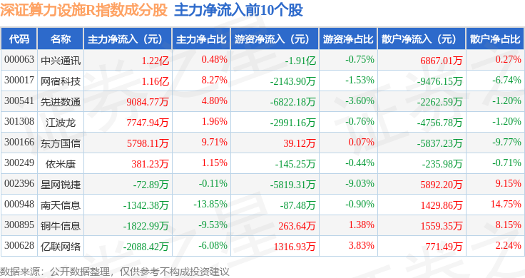 资金流向方面,深证算力设施R(470051)指数成份股当日主力资金净流出合计111.04亿元,游资资金净流入合计21.87亿元,散户资金净流入合计89.17亿元。成份股资金流向详情见下表: