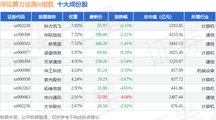 证券之星消息,10月10日,深证算力设施R(470051)指数报收于12119.03点,跌3.98%,成交1479.5亿元,换手率5.42%。当日该指数成份股中,上涨的有5家,先进数通以9.61%的涨幅领涨,下跌的有45家,浪潮信息以8.29%的跌幅领跌。
