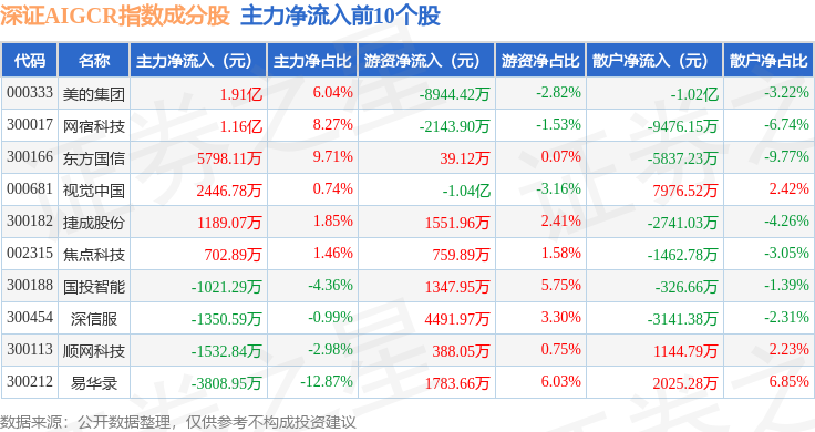 资金流向方面,深证AIGCR(470075)指数成份股当日主力资金净流出合计74.74亿元,游资资金净流入合计20.21亿元,散户资金净流入合计54.53亿元。成份股资金流向详情见下表: